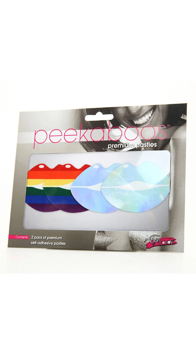 Let your lips do the talkin in this cute pasties pack featuring two pairs of premium self-adhesive pasties. Both sets feature a lips shape: One with a striped rainbow design, and the other a pastel tie dye design. Gently peel off and store away for multiple uses.