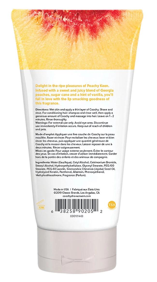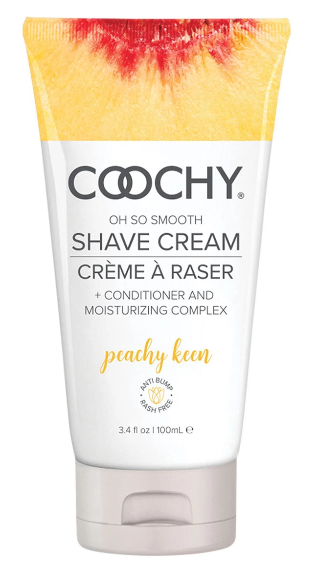 Treat yourself to a smooth, rash-free shave with Coochy Peachy Keen scented Shave Cream. This 3.4 oz Coochy cream is safe to use anywhere on the body, including legs, arms, underarms, intimate areas, head, and even the face.