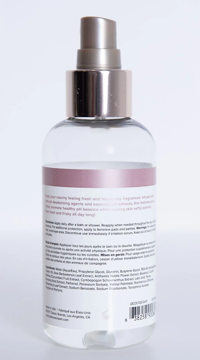 Add a blast of freshness to your look with this oh so fresh Coochy intimate feminine spray featuring a deodorizing and PH balancing complex that soothes and smooths in an aromatic peony scent.