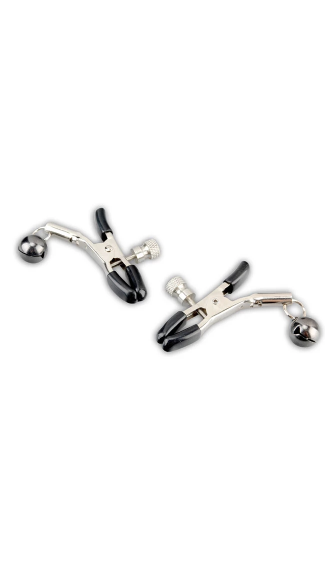 Ring in some sexy cheer with these playful nipple clamps featuring an adjustable silver steel base with black padding, and statement bell accents.