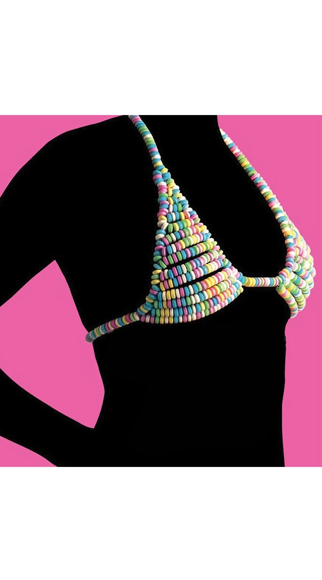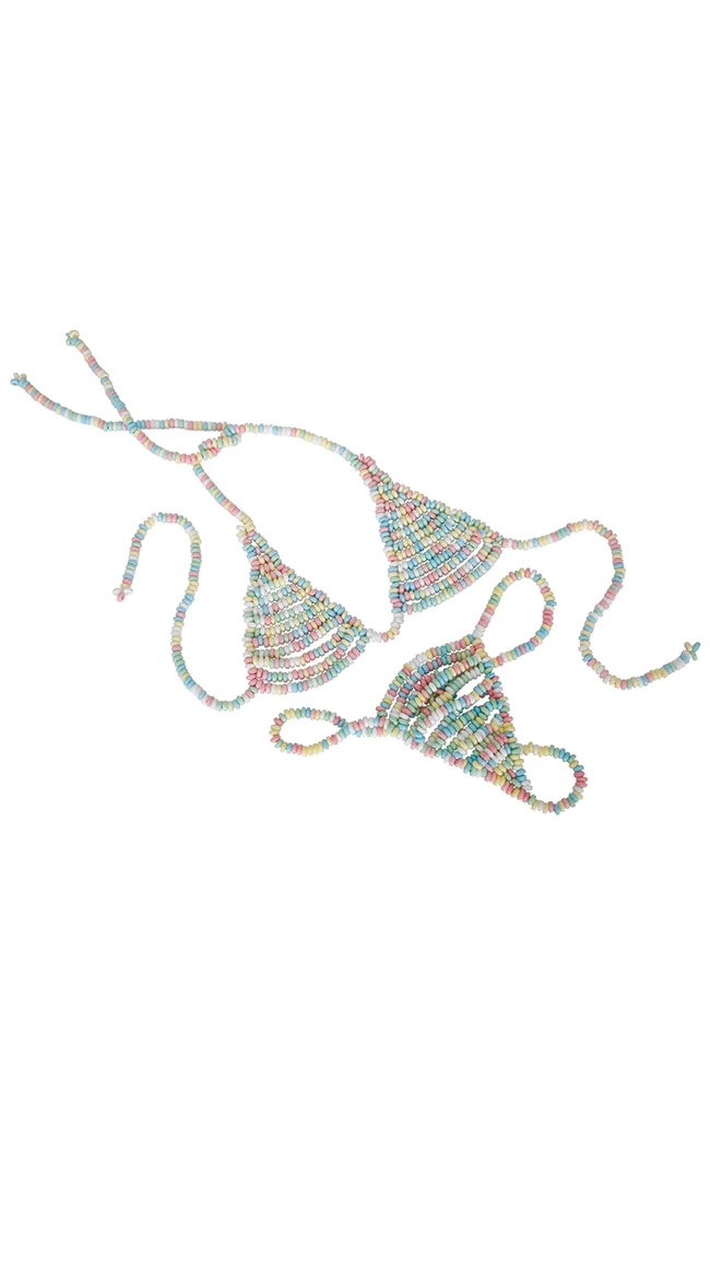 This fun wearable candy bra is the ultimate treat in edible undergarments for the boudoir and features traditional “candy necklace” beads with elastic strung throughout to create a one size fits most garment or accessory.