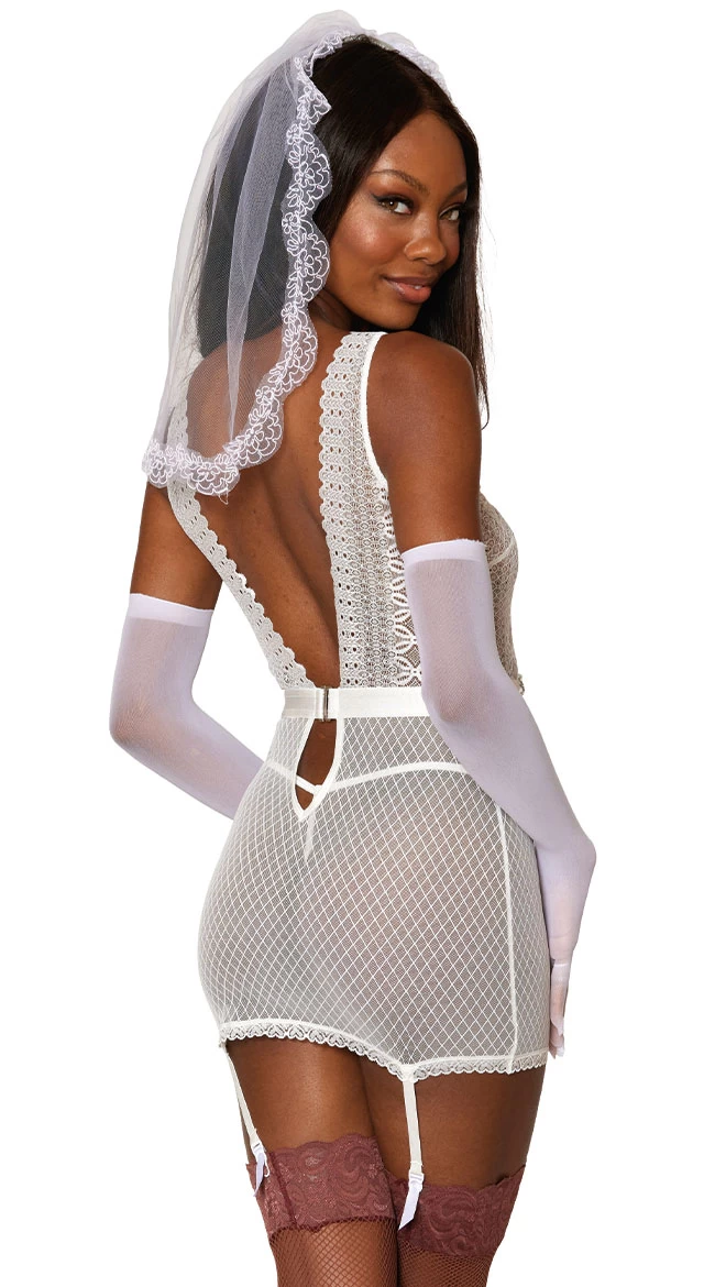 Heat up your late nights in this sexy chemise set featuring a deep V-neckline, a sheer intricate lace bust, a beaded bust detail, a deep V-back, a satin waistband with a back hook closure, a sheer diamond mesh skirt with a scalloped lace trim, adjustable garter straps, and a matching G-string. (Veil and thigh high stockings not included.)