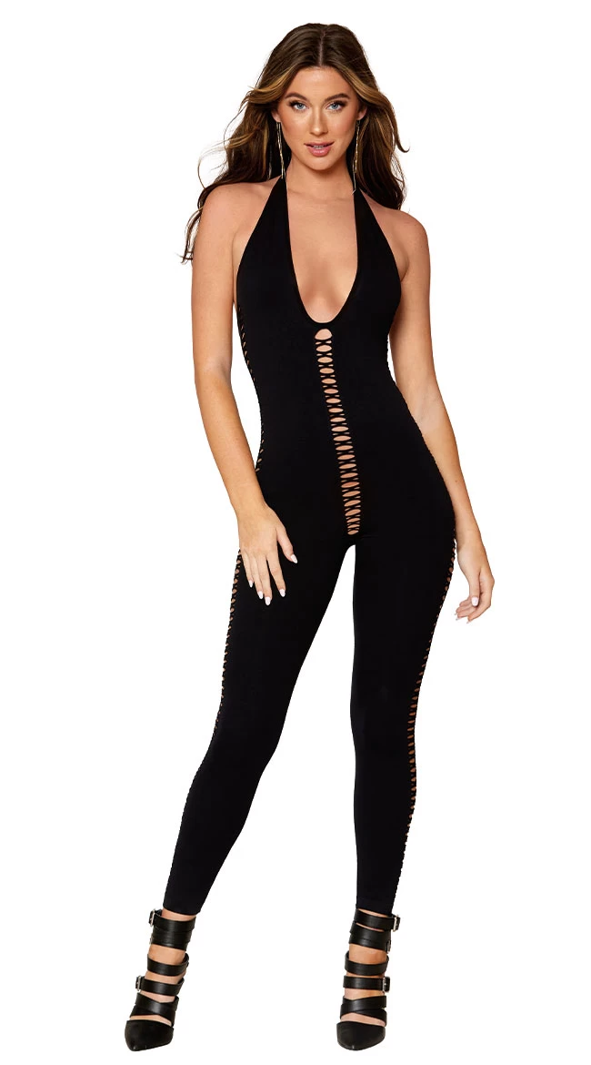Tempt and tease in this sultry bodystocking featuring halter straps a deep V-neckline, a low back, a faux waist cincher with a lace-up closure, an open front to back crotch with criss-cross strappy detailing, a fitted leg with an open toe cut, and open sides with criss-cross detailing.