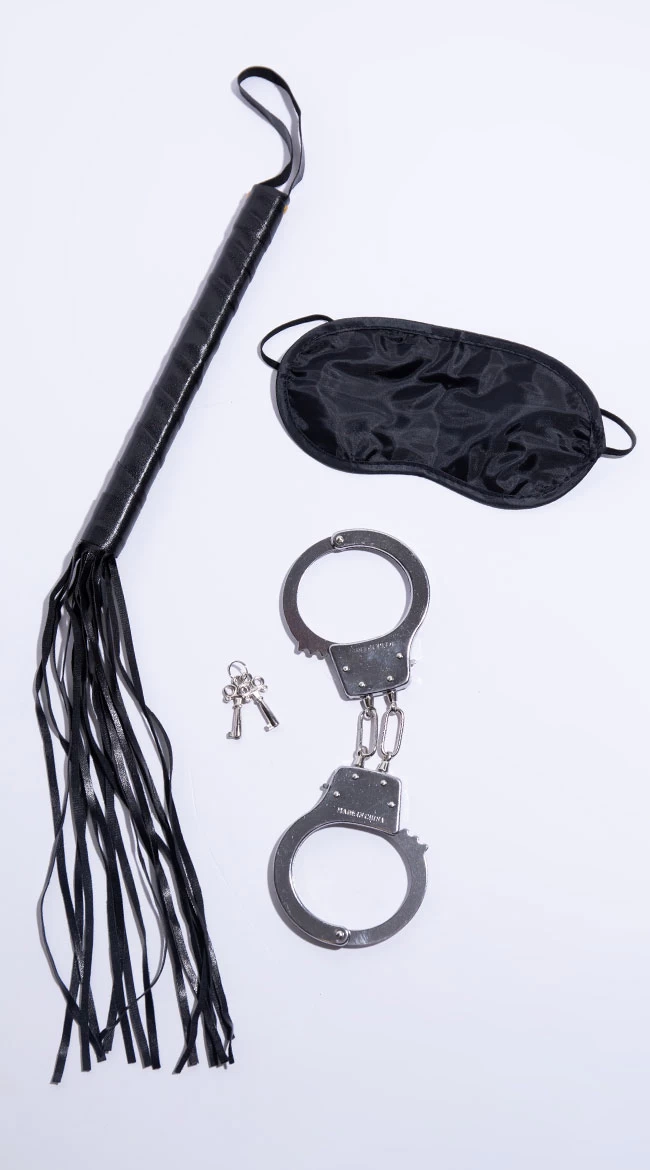 Indulge in dirty behavior all day long! Dream of fierce foreplay with this sinfully sexy three piece kit featuring a soft eye mask with an elastic back strap, silver handcuffs with attached keys, and a leather flogger with a hand loop.