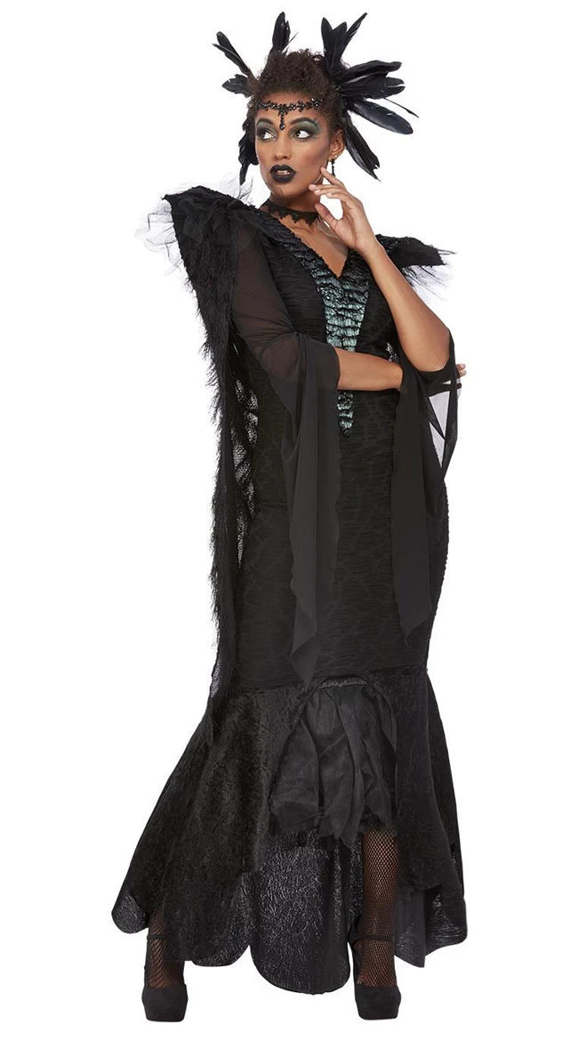Be careful, there are secrets in the wind. Choose your own destiny, and spread your wings for take off in this Free Bird Queen costume featuring a long black dress with loose mesh sleeves, a fluted skirt with a scalloped hem, a fringed cape with pointed shoulders, and a matching feather headdress. (Face makeup, choker, stockings, and shoes not included.)