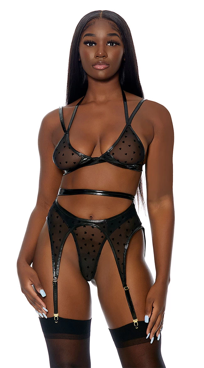 Spice up your evening with this sultry bra set featuring sheer heart mesh cups with a vinyl trim, halter straps, adjustable spaghetti straps, a hook and eye back closure, a matching garter belt with a high waisted strap detail, a hook and eye back closure, adjustable garter straps, and a matching thong. (Thigh high stockings not included.)