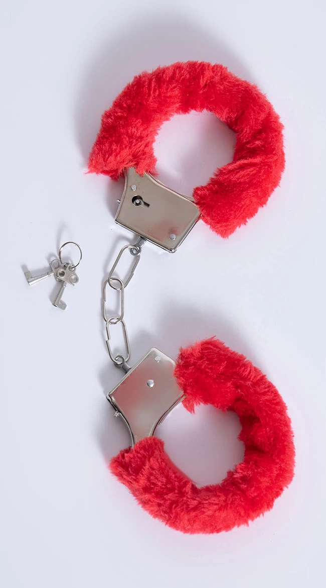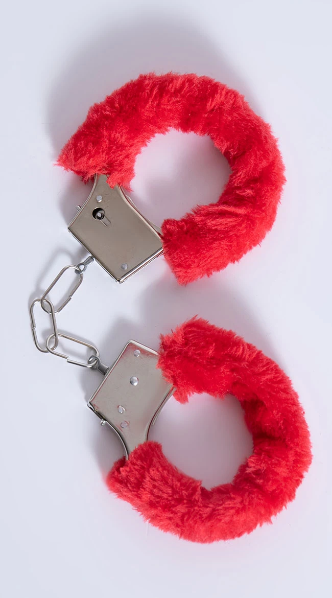 These beginner’s handcuffs featuring red faux fur trim adjust to any size wrist.