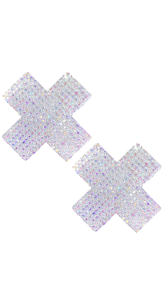 Give your dancewear or lingerie look a touch of sparkle in these stunning pasties featuring an X or plus shape, all over iridescent rhinestones, and an adhesive backing that can be peeled off and stored away for future use.