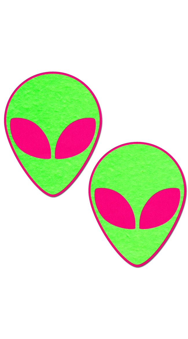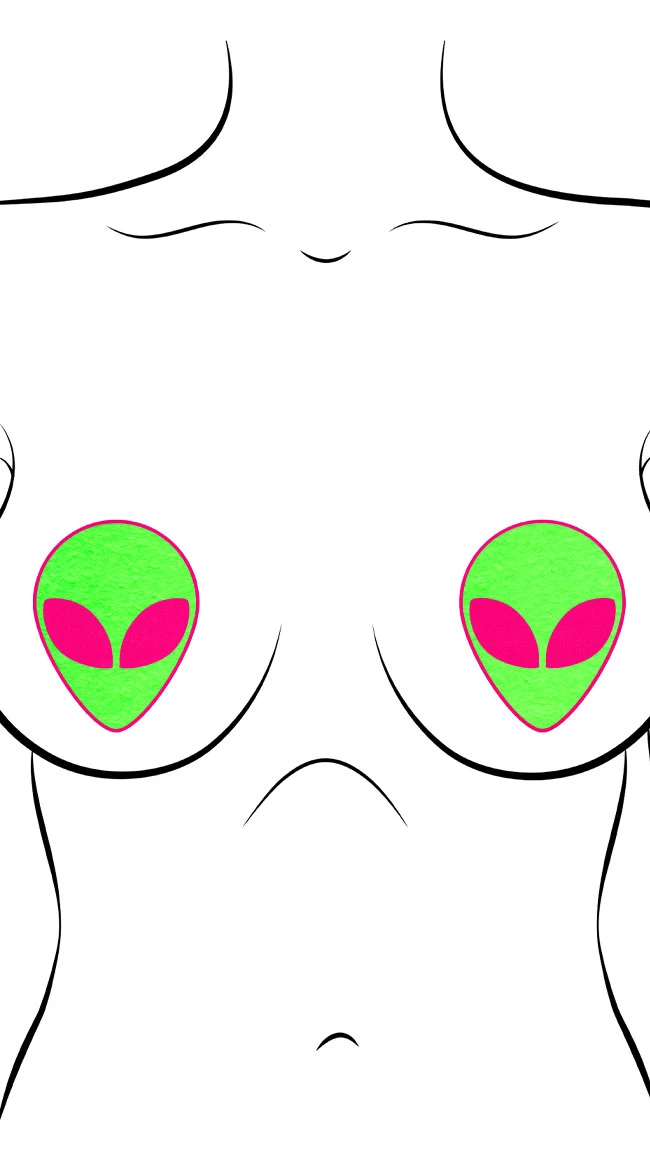 Let’s see them aliens! Be the hottest babe in the galaxy with these neon green alien pasties featuring pink alien eyes, a pink trim, and a waterproof adhesive that leaves no residue when gently removed. Glows under a black light!
