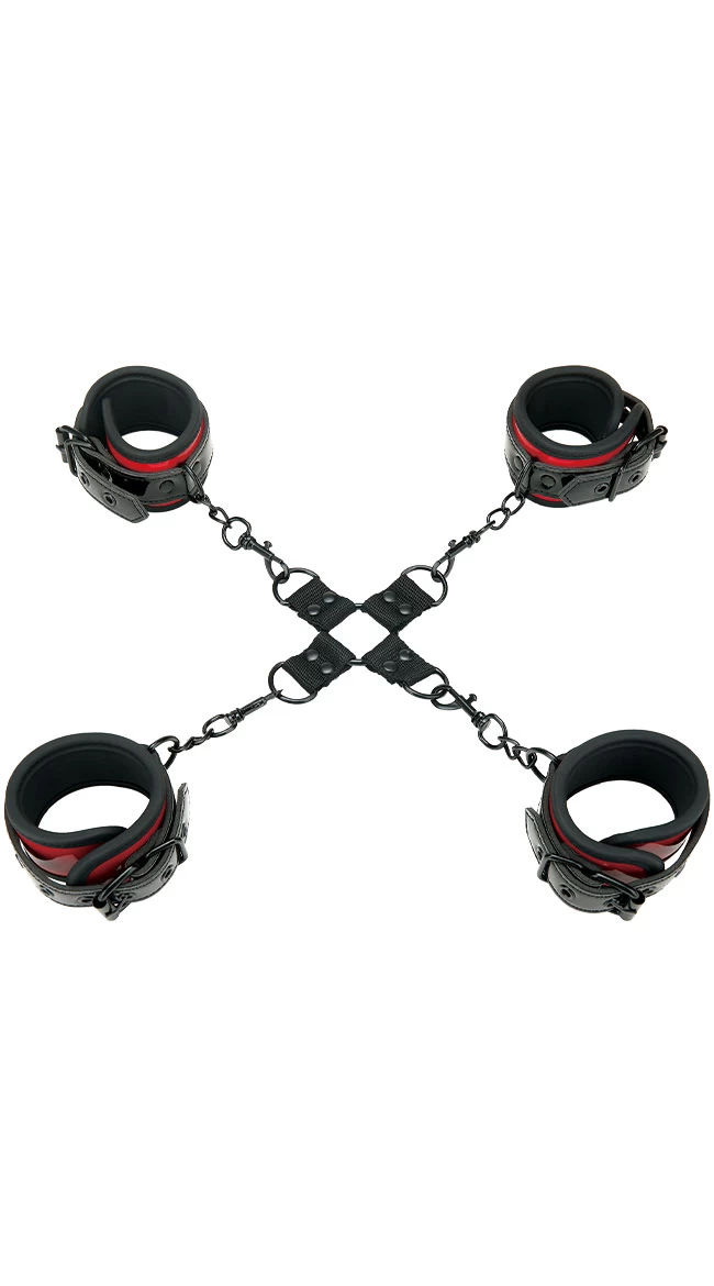 Get all tied up in this kinky hogtie featuring four red and black cuffs with adjustable buckles, black clasp closures, and a four ring connector. (Bra set not included.)