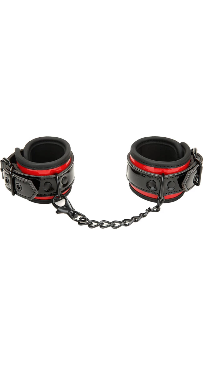 Submit to your desires in these deluxe handcuffs featuring a red and black cuff with adjustable buckles and a black chain with clasp closure.