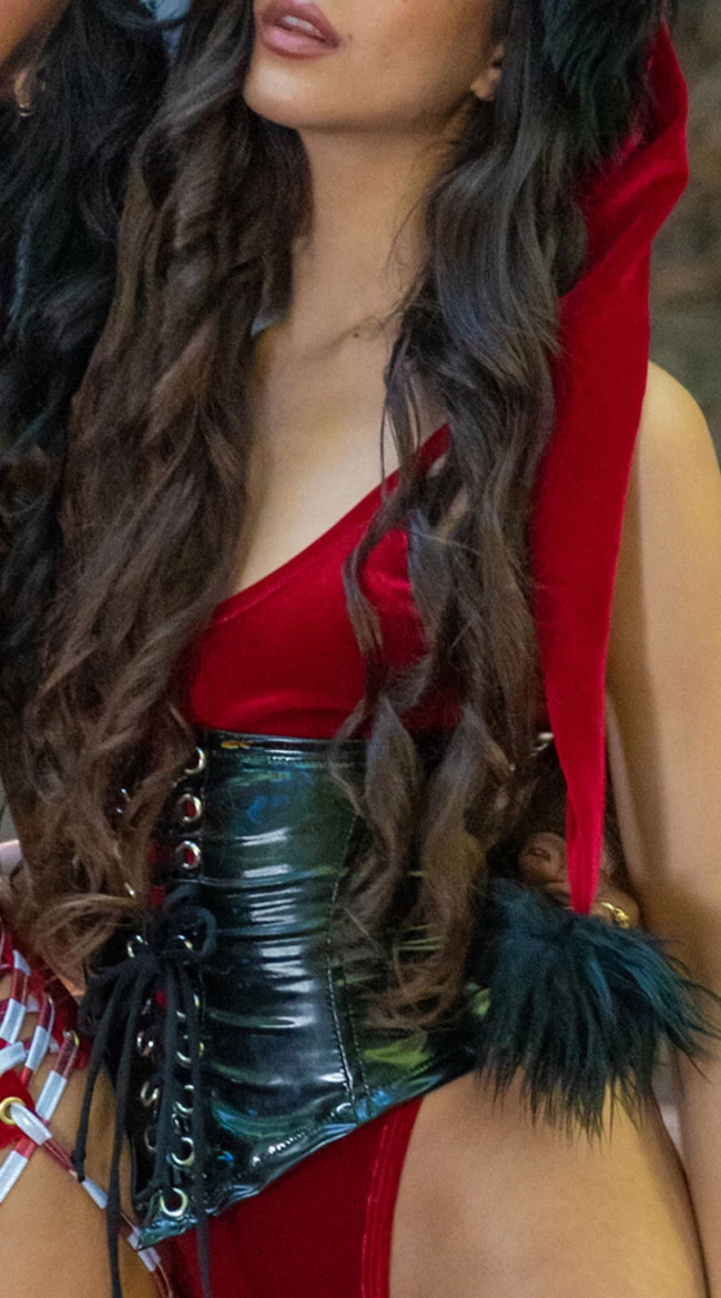 Mesmerize them with your curves in this stunning waist cincher featuring a mirrored holographic vinyl, two lace-up details with metal grommets, and vertical boning for added contouring. (Bodysuit not included.)