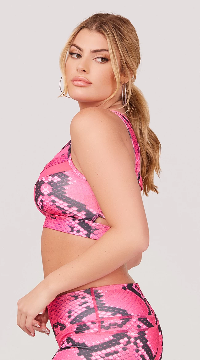 Get the support your need in this hot pink sports bra featuring a high neckline with sheer mesh paneling, an allover gray snake print design, a soft bust, a strappy back, and a comfortable underbust band. (Sports bra only.)
