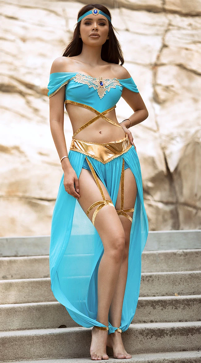 Be perfectly comfortable lazying around a palace in this Oasis Princess costume featuring an off the shoulder crop top with clear spaghetti straps, gold embroidery with a blue gem embellishment, a back zipper closure, and gold wraparound straps, matching blue split-leg harem pants with built in shorts, gold wrap garters, a gold waistband, gold ankle cuffs, and a matching blue with gem headband.