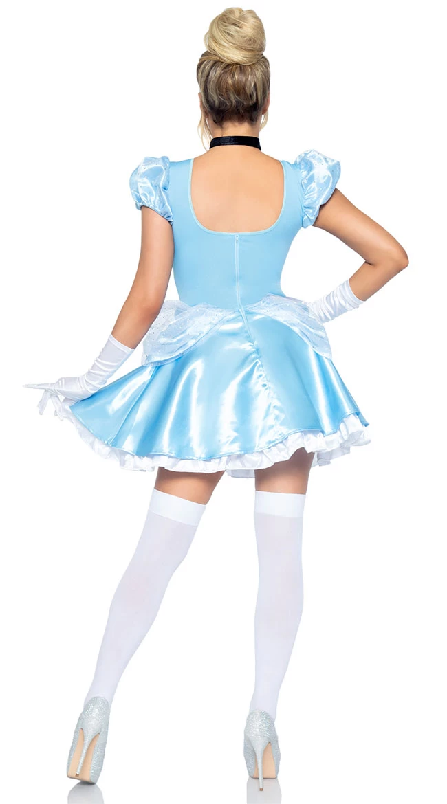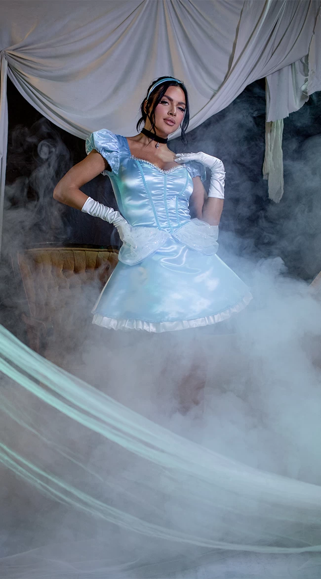 Get ready for the ball, babe! Meet your prince charming in this Storybook Princess costume featuring a light blue mini ball gown with a ruffle trim, puff sleeves, a jewel choker, and a matching headband. (Gloves, stockings, petticoat, and shoes not included.)