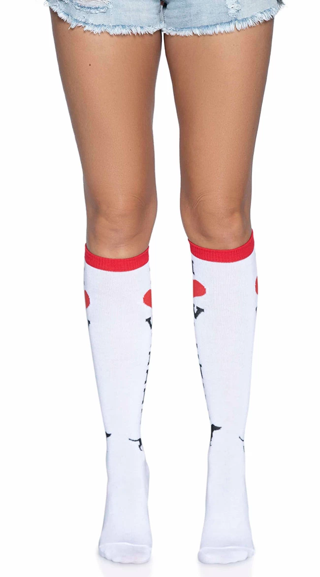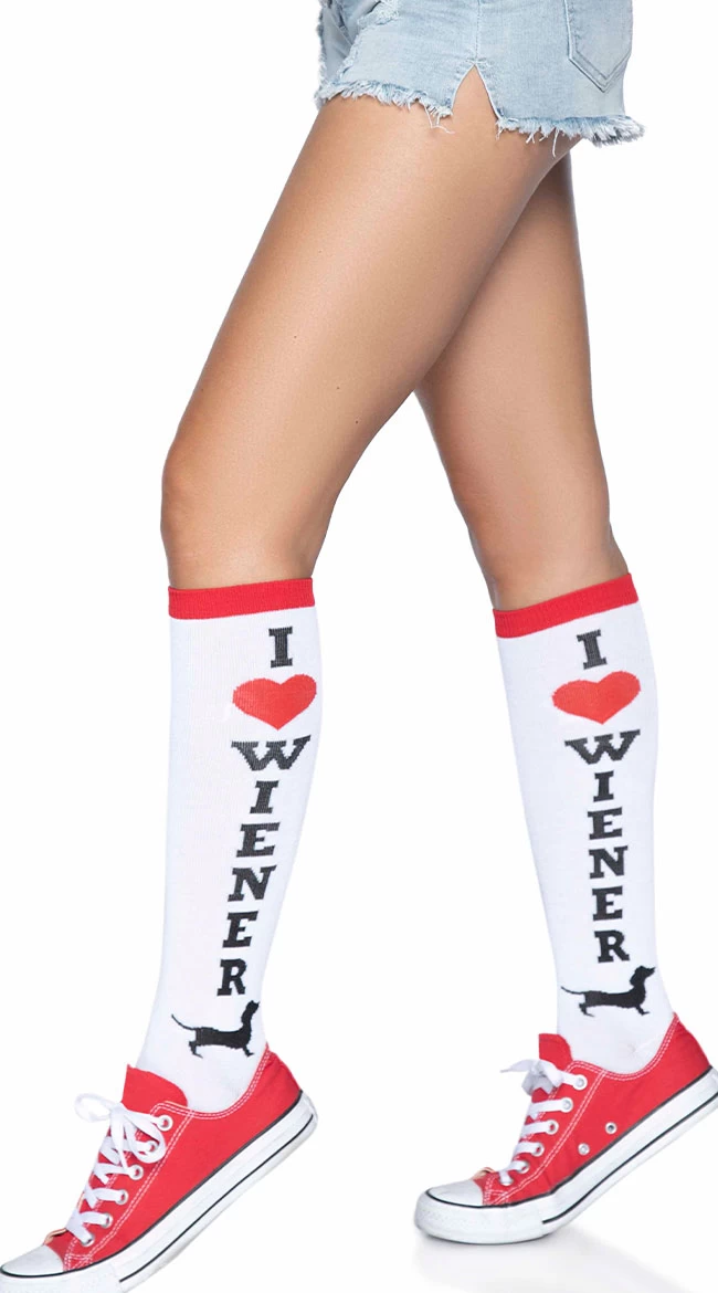 Give those puppies some love with these white knee high socks featuring a red trim, “I Heart Weiner Dogs” printed along the sides, and a red tipped heel and toe. (Shorts not included.)