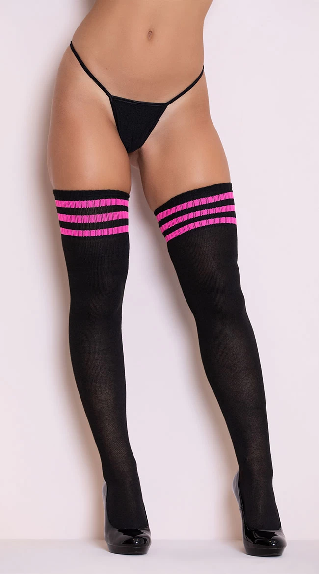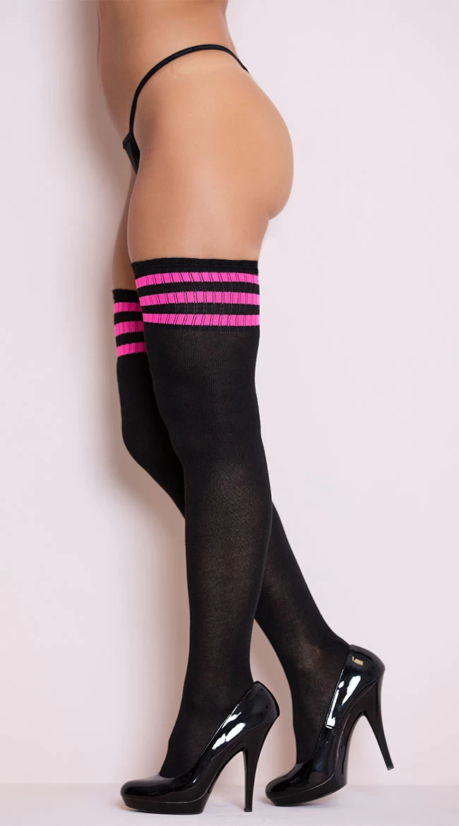Add the perfect finishing touch to your outfit or lingerie ensemble with these black thigh high socks featuring a thick, stay-up fabric and a hot pink striped top. (Panty not included.)