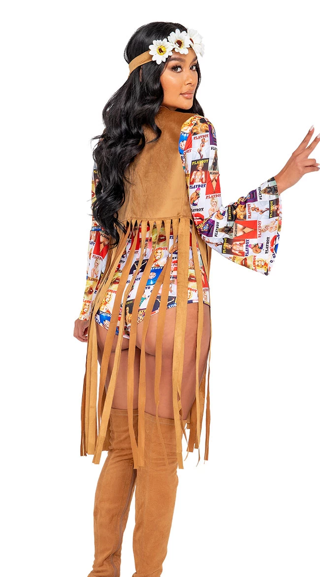 Peace and love, baby! Throwback to a groovier time in this officially licensed Playboy Groovy Babe costume featuring a bodysuit with a V-neckline, long bell sleeves, an allover Playboy magazine cover print, a cheeky cut back, a brown suede vest with long, draping fringe, and a white floral headpiece. (Boots not included.)