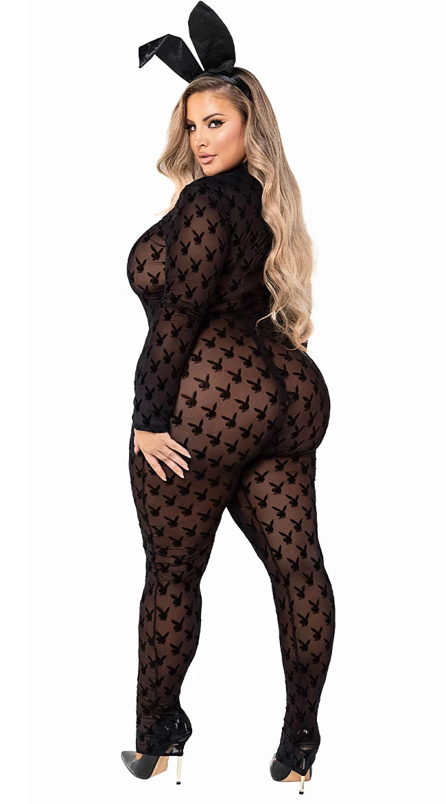 Ultra sexy and absolutely stunning, this Playboy officially licensed plus size Risque Rabbit costume features a sheer catsuit with flocked bunny design, long fitted sleeves, an ankle length, and a matching bunny ears headpiece. (Shoes not included.)