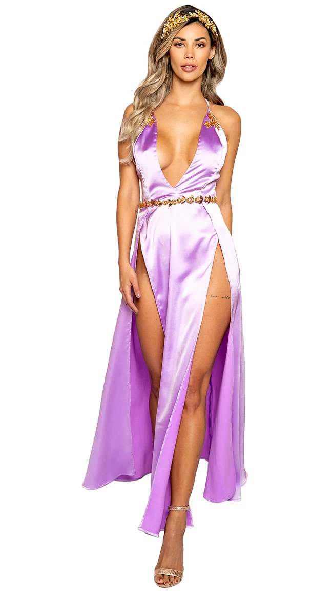 Did you die and go to heaven? Strut through the celestial city like it’s your runway in this Heavenly Cloud Goddess costume featuring a lavender satin gown with plunging neckline, adjustable crossing spaghetti straps with gold appliques, high cut side slits, and a matching gold floral waist belt. (Gold headpiece and shoes not included.)