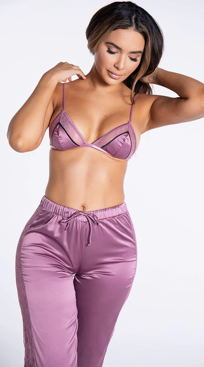 Add a touch of elegance to your pajama collection with this sexy satin pant set featuring a satin bralette with triangle cups, contrast piping, a sheer lace trim, adjustable spaghetti straps, a hook back closure, and matching wide leg pants with a drawstring elastic waistband, and sheer lace side panels.