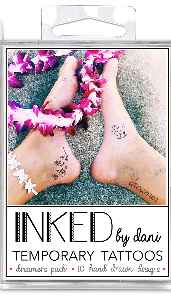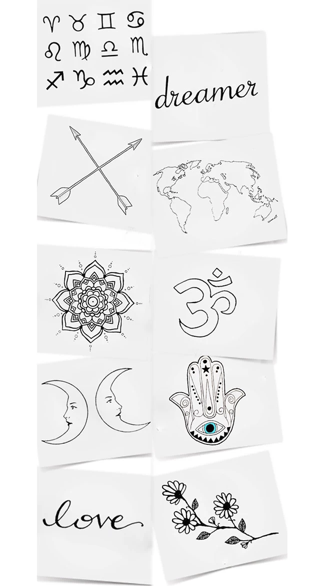 Daydream of travelling the world like the free spirit that you are in this temporary tattoo pack featuring over 10 hand drawn designs with a map of the world, soothing words, and yoga and meditation symbols. Wear your tattoos anywhere on your body and easily remove them when you are ready to show off another creative design!