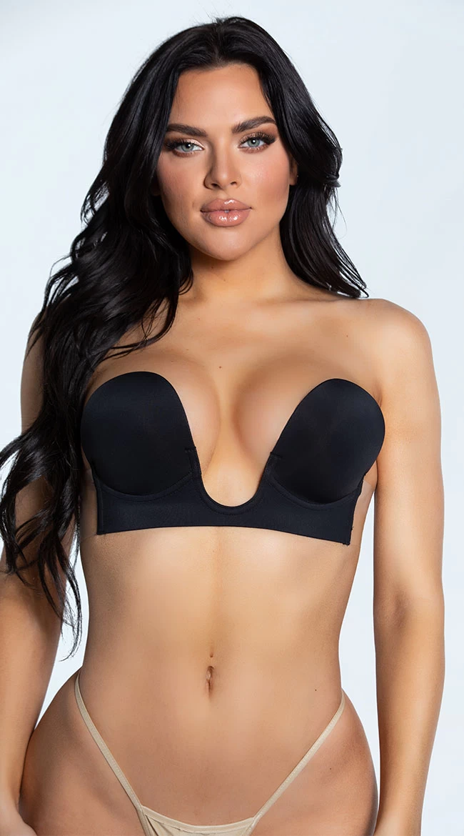 This strapless bra features push-up cups, a plunging U-neckline, and clear adhesive wings to give you the ultimate backless and strapless look.
