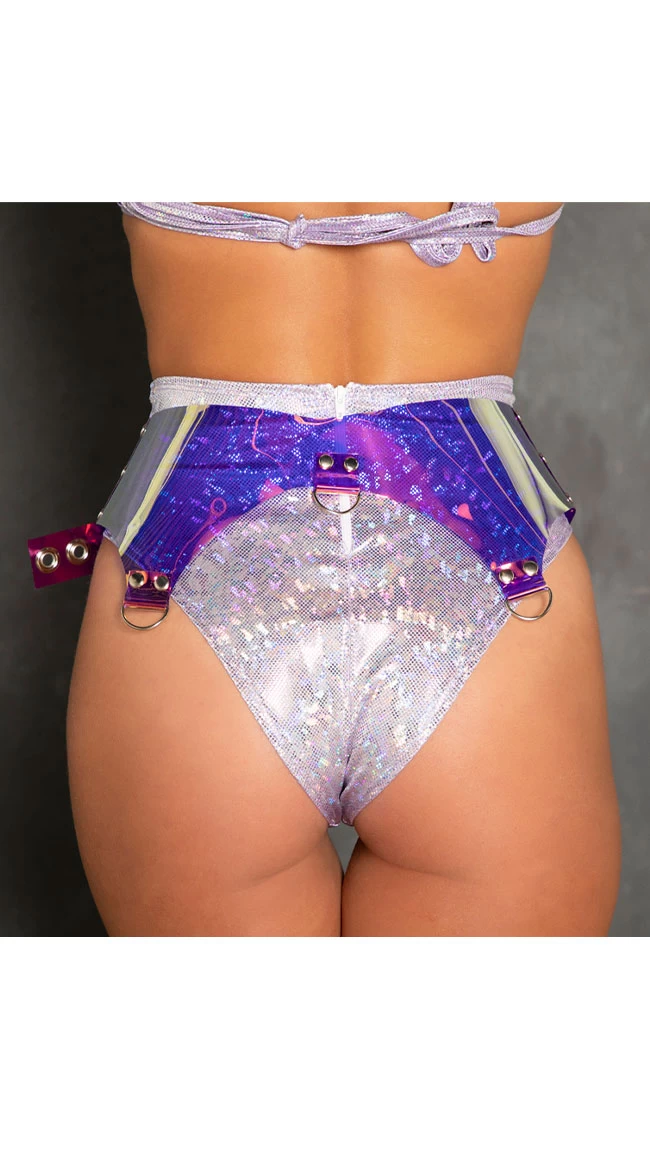 Feminine and futuristic, complete your festival look with this trendy holographic garter belt featuring an adjustable buckle front closure with a studded trim and D-ring accents. (Bodysuit and shorts not included.)