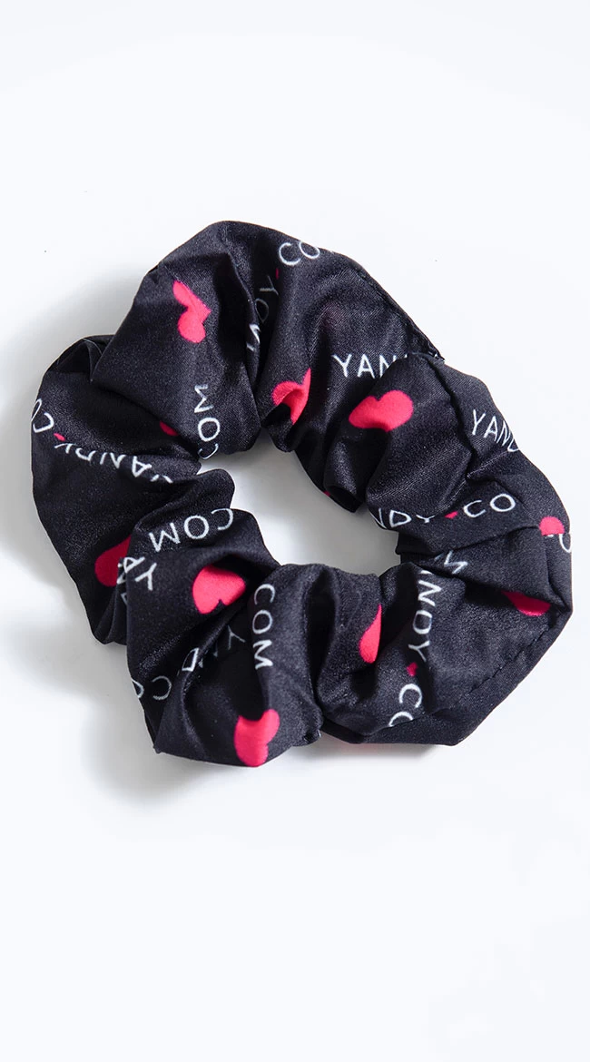 Keep your locks looking fresh and crease-free, and get on trend with this cute hair scrunchie! You know your hair game will be on point at home or on-the-go in this branded scrunchie featuring a black shiny fabric with a repeating white Yandy logo and pink hearts. (Top not included.)