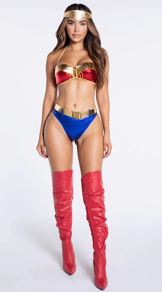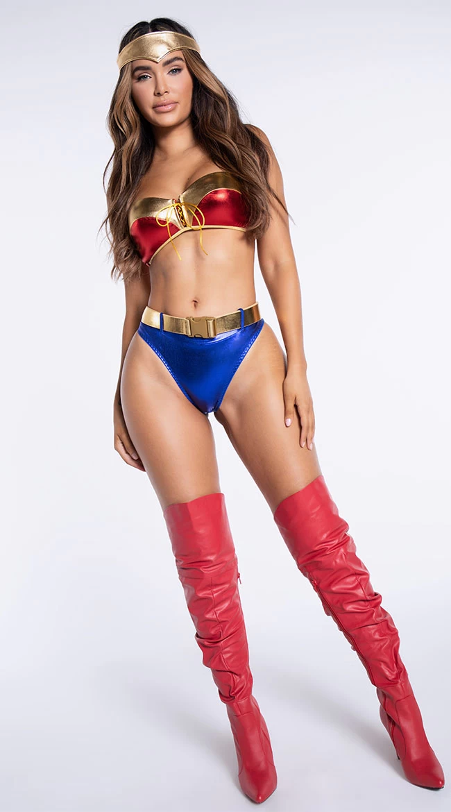 Are you feeling super sexy? You’ll forever be a hero in his eyes in this exclusive Super Hottie costume featuring a red and gold metallic bra top with lace-up front detail, halter ties, a hook and eye back closure, a blue high cut bottom with belt loops, a gold waist belt, and a matching gold headpiece. (Boots not included.)